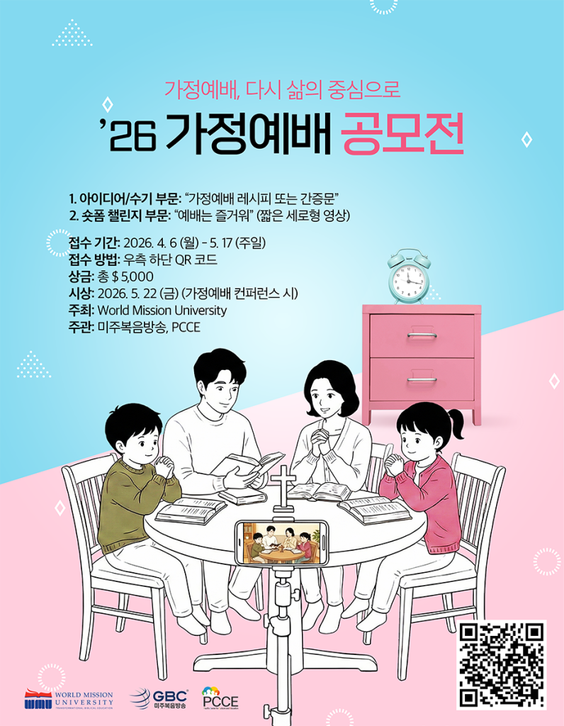 🎁 시상 및 혜택 – 총 상금 규모: $5,000 – 특전: 수상작은 향후 ‘가정예배 가이드북(PDF)’에 수록되어 이민 교회 가정예배 모델로 보급되며, 다큐멘터리 제작 참여 기회가 주어집니다.